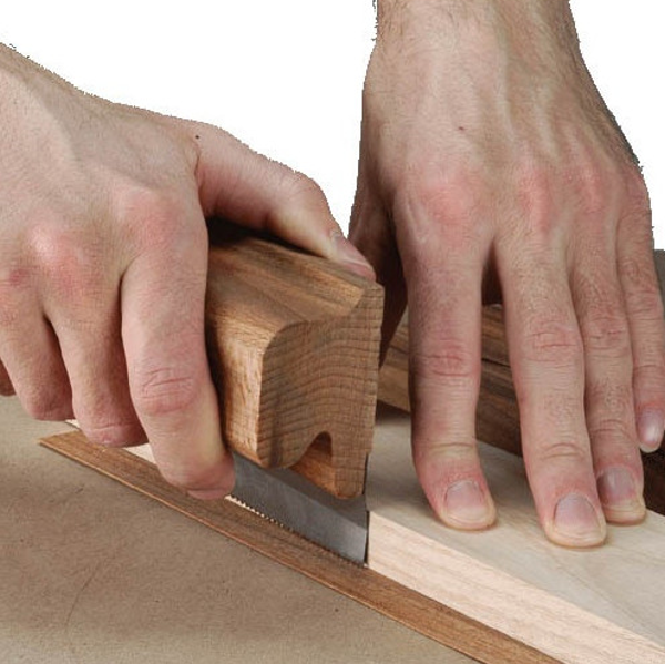 - Lame acier avec denture symétrique par rapport au centre pour couper en tirant ou en poussant, non avoyée pour un trait de coupe fin, plane dessous et biseautée dessus.